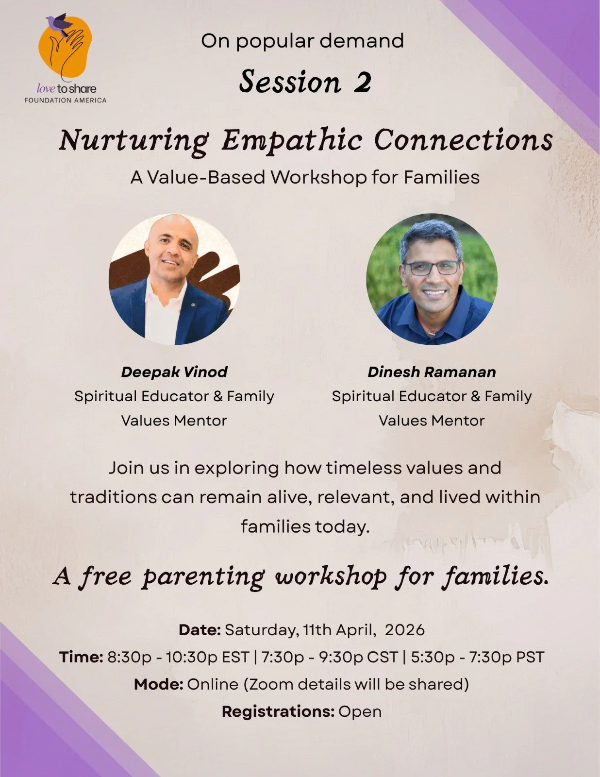 This workshop is designed to help families rediscover the timeless wisdom of living with purpose and compassion. By grounding our daily interactions in universal human values, we can transform the way we relate to one another and the world around us.